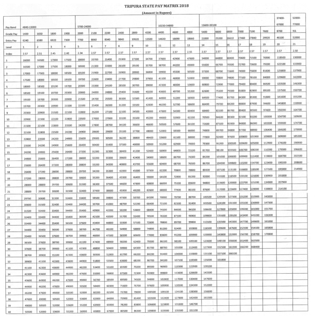 The Expert Committee has recommended the Tripura State Pay Matrix 2018 Based on 7th CPC Recommendation of 7th Pay Commission. The Government of Tripura, Department of Finance has published notification for implementation of revised Pay scale for Tripura State Govt Employees.