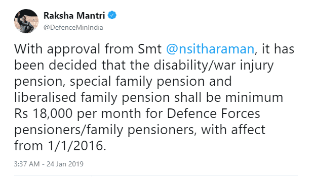 With approval from Smt @nsitharaman, it has been decided that the disability/war injury pension, special family pension and liberalised family pension shall be minimum Rs 18,000 per month for Defence Forces pensioners/family pensioners, with affect from 1/1/2016.
