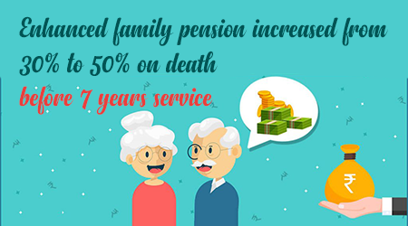 The Government felt that the need for family pension at enhanced rate is more in the case of a Government servant who dies early in his career, as his pay at the initial phase of service is much less. The Government has, therefore, amended Rule 54 of the Central Civil Services (Pension) Rules, 1972 by a notification dated 19th September, 2019. As per the amended Rule 54, the family of a Government servant, who dies within seven years of joining service, will also be eligible for family pension at enhanced rate of 50% of last pay drawn, for a period of 10 years.