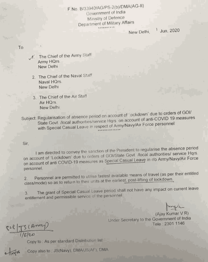 I am directed to convey the sanction of the President to regularise the absence period on account of ‘Lockdown‘ due to orders of GOI/State Govt./Local authorities/service Hqrs. on account of anti COVID-19 measures as Special Casual Leave in r/o Army/Navy/Air Force personnel.