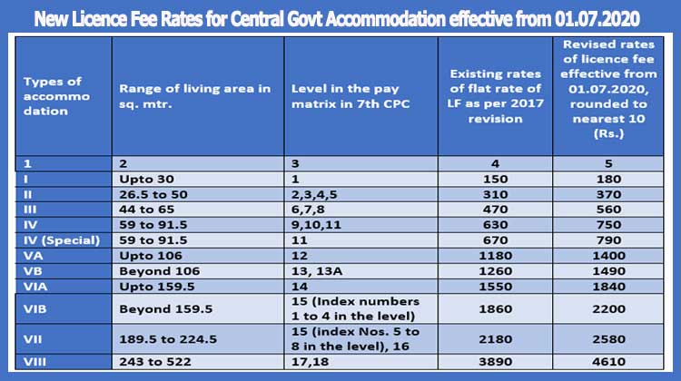 New Licence Fee Rates for Central Govt Accommodation effective from 01.07.2020