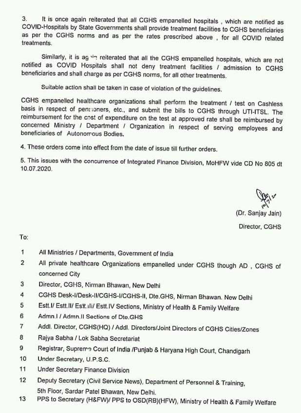 Similarly, it is again reiterated that all the CGHS empanelled hospitals, which are not notified as COVID Hospitals shall not deny treatment facilities / admission to CGHS beneficiaries and shall charge as per CGHS norms, for all other treatments. Suitable action shall be taken in case of violation of the guidelines.