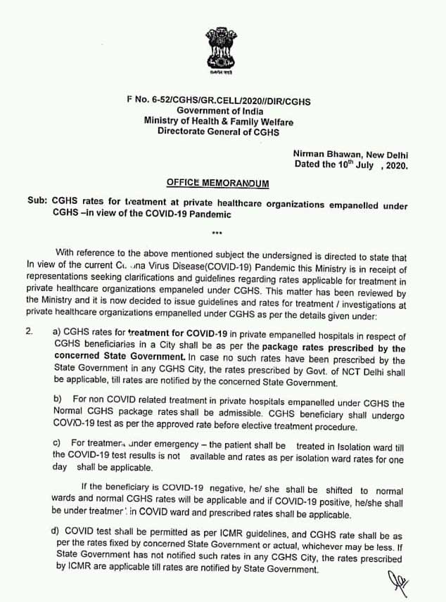 a) CGHS rates for treatment for COVID-19 in private empanelled hospitals in respect of CGHS beneficiaries in a City shall be as per the package rates prescribed by the concerned State Government. In case no such rates have been prescribed by the State Government in any CGHS City, the rates prescribed by Govt. of NCT Delhi shall be applicable, till rates are notified by the concerned State Government.