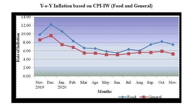 Year-on-year inflation based on all-items stood at 5.27 per cent for November, 2020 as compared to 5.91 per cent for the previous month and 8.61 per cent during the corresponding month of the previous year. Similarly, Food inflation stood at 7.48 per cent against 8.21 per cent of the previous month and 9.87 per cent during the corresponding month a year ago.