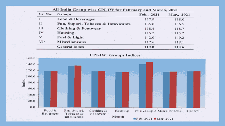 The All-India CPI-IW for March, 2021 increased by 0.6 points and stood at 119.6 (one hundred nineteen and point six). On 1-month percentage change, it increased by 0.50 per cent with respect to previous month whereas there was a decline of 0.61 per cent between corresponding months a year ago.