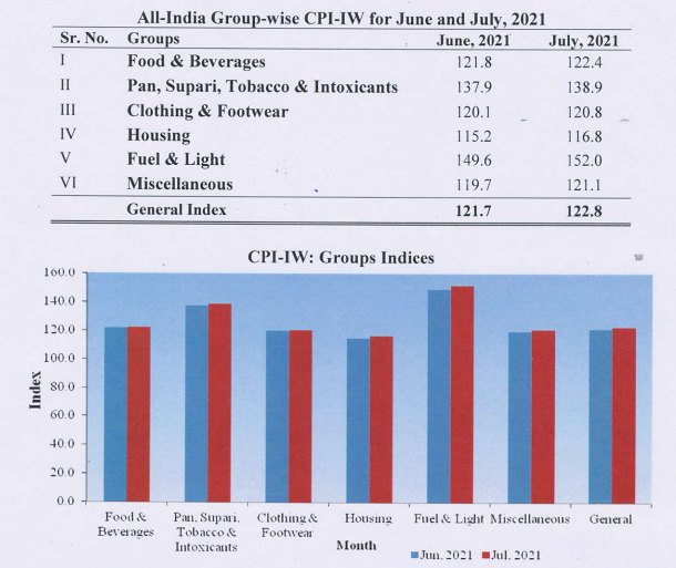 All India CPI-IW for July 2021 : The All-India CPI-IW for July, 2021 increased by 1.1 points and stood at 122.8 (one hundred twenty two and point eight).
