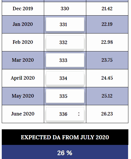 Use this expected DA Calculator from July 2020 to calculate DA hike by assuming the AICPIN points for left out months.